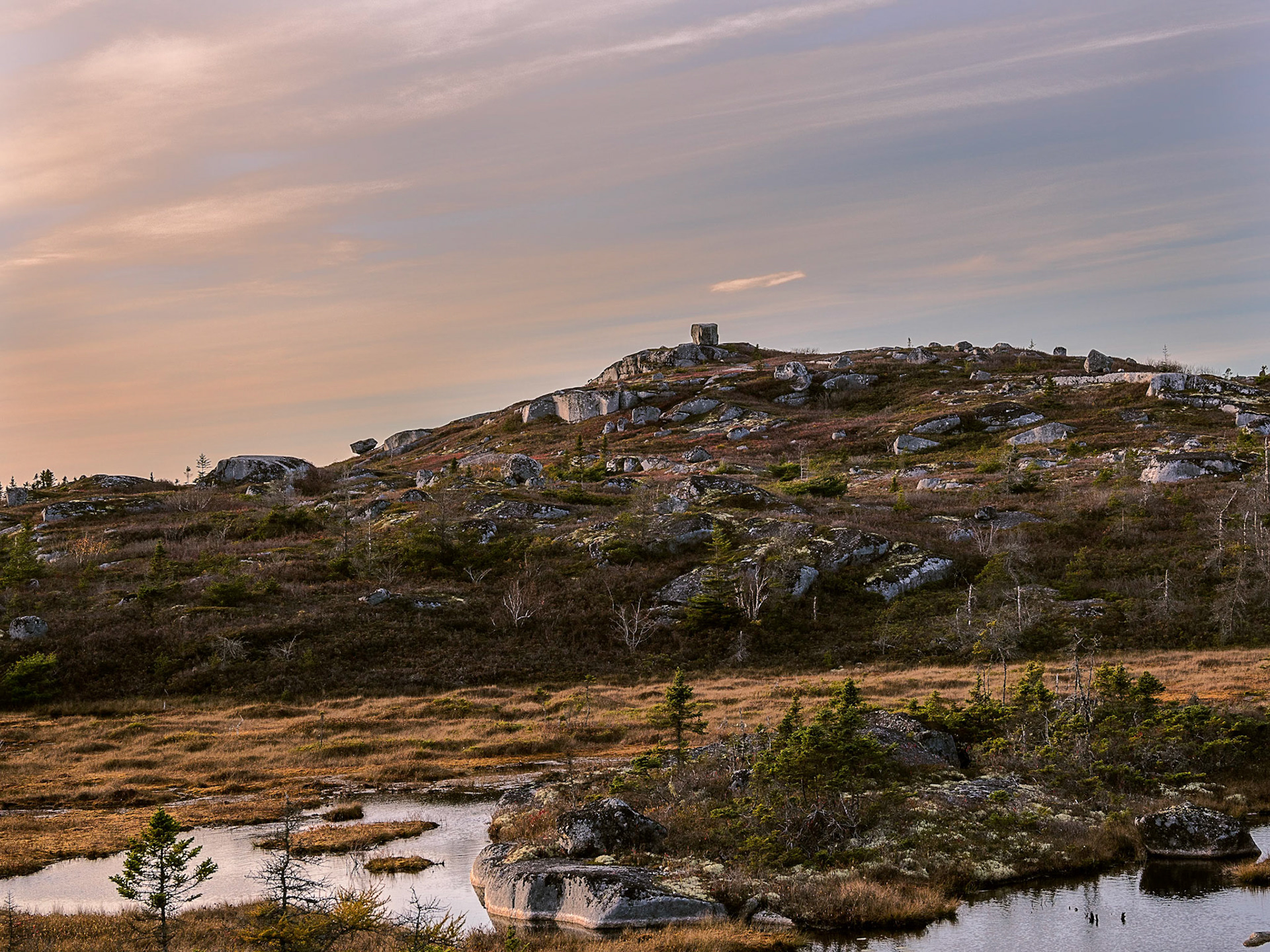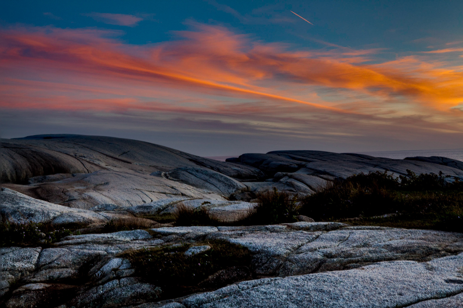 More than 400 million years ago, in the Devonian Period, the plate tectonics movement of the Earth's crust allowed molten material to bubble up from the Earth's interior. This formed the rocks we see today and are part of the Great Nova Scotia batholith. The unique landscape of Peggy's Cove and surrounding areas was subsequently carved by the migration of glaciers and the ocean tides. About 20,000 years ago, an ice ridge moved south from Canada's Arctic region covering much of North America. Along with the ebb and flow of the glaciers, the ice ridge eventually melted and shifted and in the process scooped away and scoured large sections of rock, vegetation, and topsoil. As melted land glaciers flowed back to the oceans the changing tidal flows and rising sea levels filled the scarred areas with water, forming coves and inlets. Large boulders composed of 415-million-year-old Devonian granite, called glacial erratics, were lifted by the ice and carried for long distances before being deposited upon the landscape as the ice receded, leaving rugged barrens. The movement of the glacial ice and rocks left scouring marks in the bedrock that are still visible.